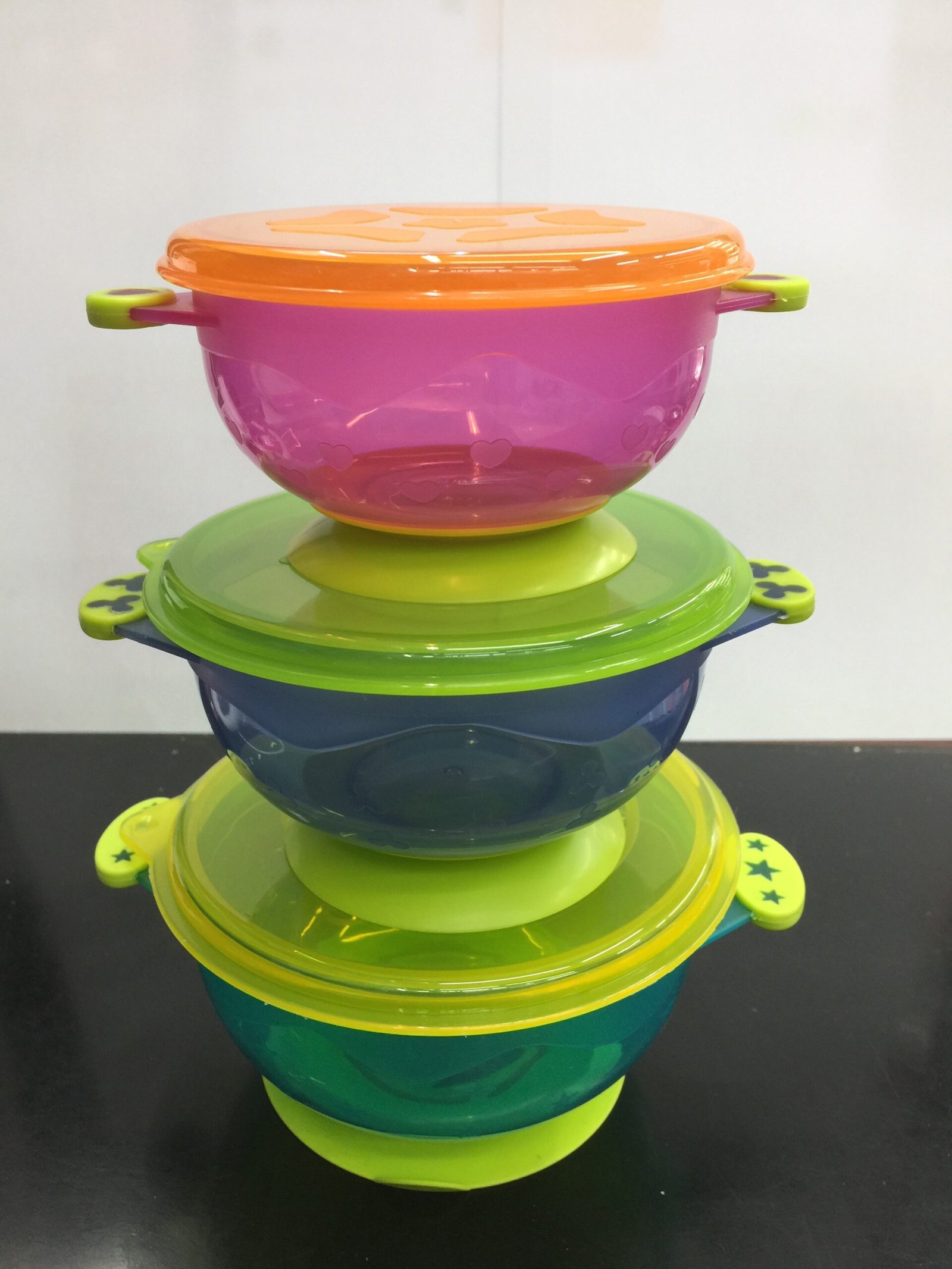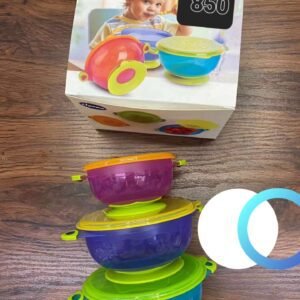 What a great way to pack, carry and feed your little one with this set of bowls. Comes in two sizes that are easily stacked together. each bowl has a lod and a sunction.