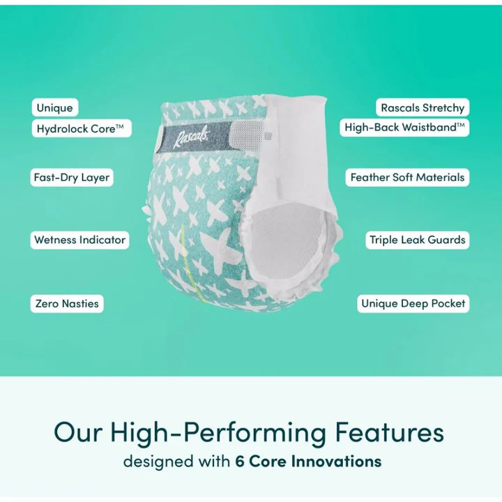 Rascals Premium Diapers are engineered with 6 Core Innovations for a high-performing diaper that’s dermatologist tested safe on sensitive skin and has up to 70% more absorbency area. Made with our unique Hydrolock Core™ that holds up to 25x its weight in liquid for up to 12 hours of advanced leak protection that means fewer blowouts, less mess and less stress for you.